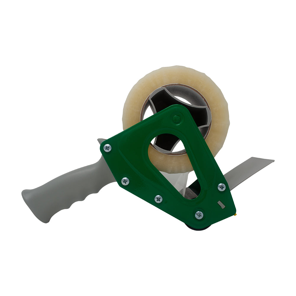 Professional, heavy duty, all steel frame tape gun for tape up to 3 inch wide. Designed for high productivity applications, this dispenser side loading dispenser has a hardened blade, natural rubber roller, and molded finger grip. The H75CP-SS has an adjustable tension brake and our patented safety shield.