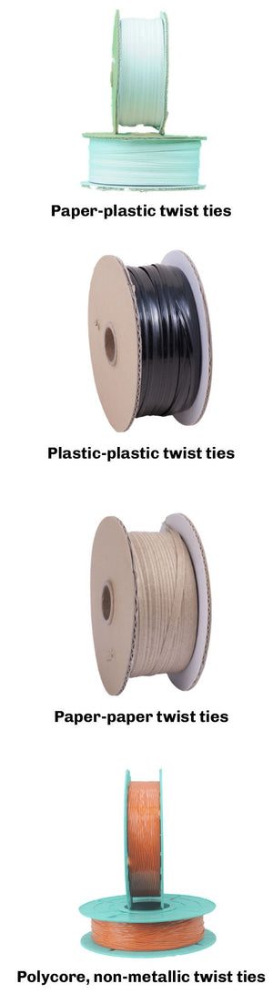 Paper/plastic twist ties have both a paper and plastic layer, are compatible with the majority of twist tie machines, and are commonly used in retail, grocery stores, and dry cleaning operations.