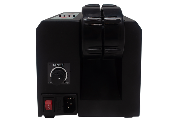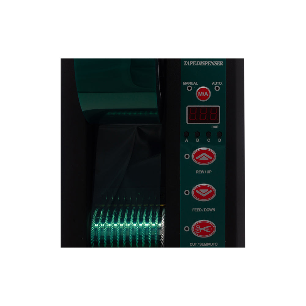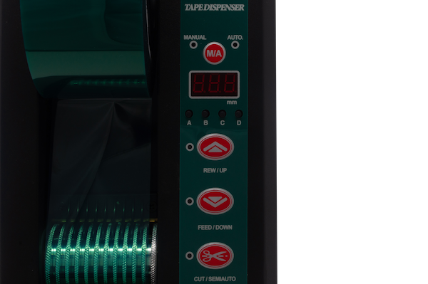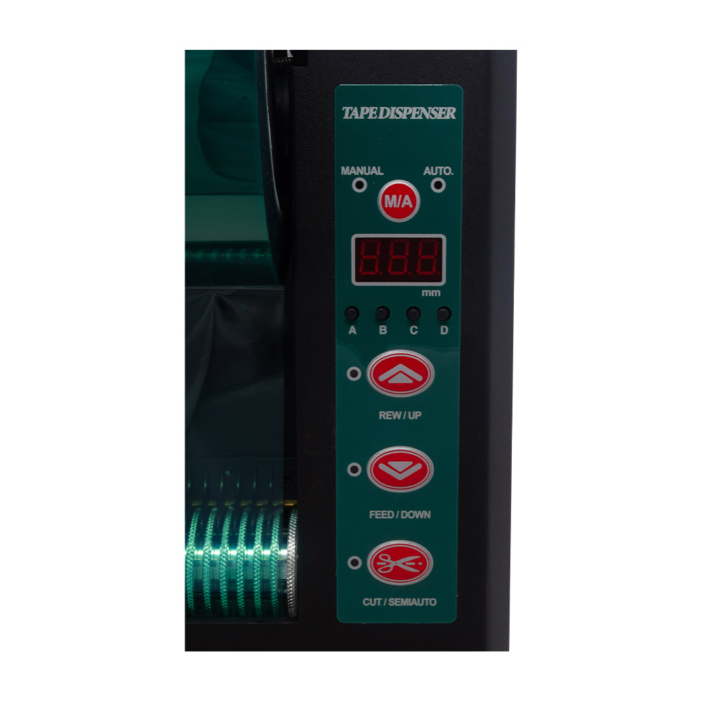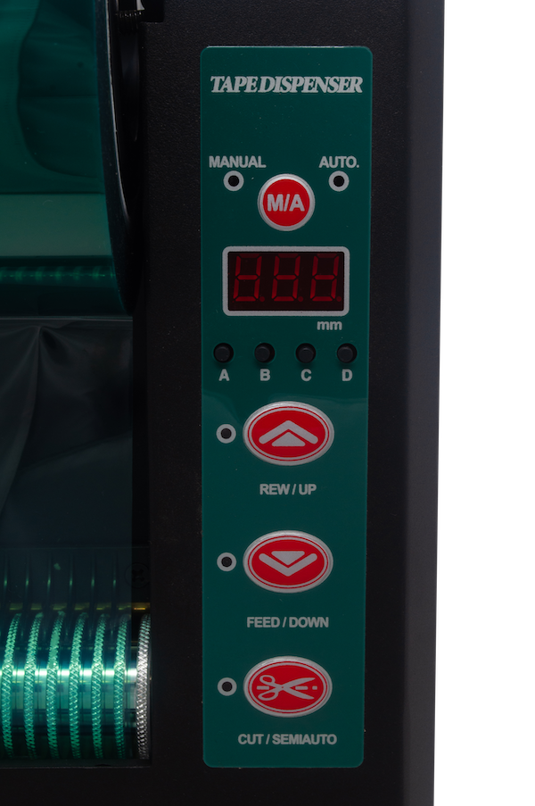 This heavy duty automatic feed and cut definite length tape dispenser can work with 1 roll of tape up to 2 inch wide or 2 rolls of tape up to 1 inch wide each. As the most durable definite length dispenser due to the all metal internal components, the 6115 is reliable and easy to use with push button and LED controls and 4 programmable memory presets. The Tach-It Model 6115 can cut most types of pressure sensitive tape from 1/2 inch to 39.3 inches in length. The 6115 has 3 modes. In random mode, the operator presses the feed button until the desired length of tape is fed and then presses the cut button to cut the tape. In Semi-Automatic mode, the pre-determined length of tape is fed and cut and removed from the machine. When the operator is ready for the next length of tape, they press the cut button and the tape is fed to the pre-determined length. In Automatic mode, the model #6115 will feed the tape to the pre-determined length and once removed from the machine, the next piece of tape is immediately fed. Small bench top design, exclusive safety shield to protect the operator, and adjustable tape pressure to ensure positive tape feeding are all advantages of this machine.