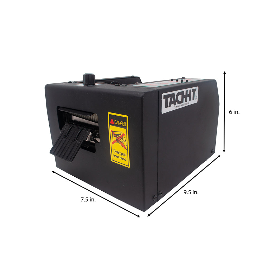This heavy duty automatic feed and cut definite length tape dispenser can dispense and cut most commonly found packaging tapes and materials up to 3 1/8 inch wide. As the most durable definite length dispenser due to the all metal internal components, the 6180 is reliable and easy to use with push button and LED controls and 4 programmable memory presets. The Tach-It Model 6180 can cut from 1/2 inch to 39.3 inches in length. The 6180 has 3 modes. In random mode, the operator presses the feed button until the desired length of tape is fed and then presses the cut button to cut the tape. In Semi-Automatic mode, the pre-determined length of tape is fed and cut and removed from the machine. When the operator is ready for the next length of tape, they press the cut button and the tape is fed to the pre-determined length. In Automatic mode, the model #6180 will feed the tape to the pre-determined length and once removed from the machine, the next piece of tape is immediately fed. Small bench top design, unique cradle design that holds the roll of tape and allows for large roll capacity without any concern for core size and adjustable tape pressure to ensure positive tape feeding are all advantages of this machine.